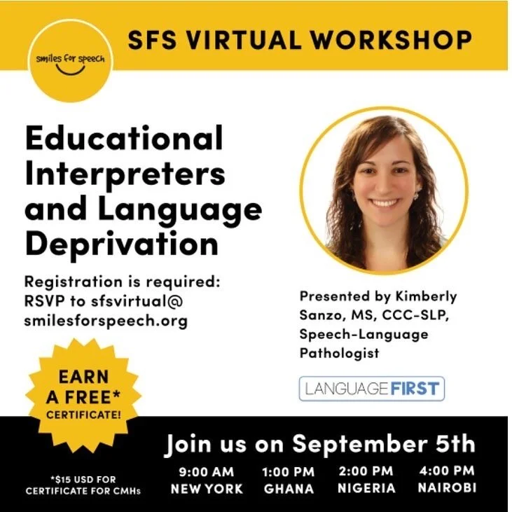 Educational Interpreters and Language Deprivation Saturday, September 5, 2020 9:00 AM 10:00 AM 09:00 10:00 Google Calendar ICS Registration is required: RSVP to sfsvirtual@smilesforspeech.org.